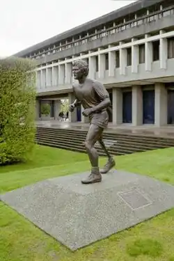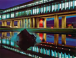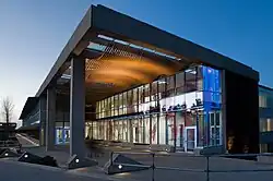 The main campus is located atop Burnaby Mountain, on Traditional Coast Salish Lands, including the Tsleil-Waututh (səl̓ilw̓ətaɬ), Kwikwetlem (kʷikʷəƛ̓əm), Squamish (Sḵwx̱wú7mesh Úxwumixw) and Musqueam (xʷməθkʷəy̓əm) Nations.[27] The campus is at an elevation of 365 metres, overlooking the Burrard inlet to the north. All major departments in the university are housed at the Burnaby campus. The library on the main campus is called the W. A. C. Bennett Library, named after the Social Credit Premier of B.C. who established it. The campus also has two gym complexes, named the Lorne-Davies Complex and Chancellor's Gym. An international-sized swimming pool is located within the Lorne-Davies Complex. Since the School of Contemporary Arts relocation to the Woodward's location, the Burnaby campus production theatre has been vacant. Located within the heart of the campus are the Museum of Archaeology and Ethnology and three art galleries. The campus has been awarded numerous architectural awards over the years, including the gold medal for Lieutenant-Governor 2009 Awards in Architecture and the 2007 Royal Architectural Institute of Canada's Prix du XXe siècle.[28][29]