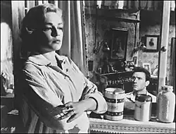 Signoret's sensual features and earthy nature led to type-casting and she was often seen in roles as a prostitute.[8][9][10][11] She won considerable attention in La Ronde (1950),[12] a film which was banned briefly in New York City as immoral.[13] She won further acclaim, including an acting award from the British Film Academy, for her portrayal of another prostitute, Amélie Élie, in Jacques Becker's Casque d'or (1951), which in France became a signature role for her.[14][15] She appeared in many French films during the 1950s, including Thérèse Raquin (1953), directed by Marcel Carné,[16] Les Diaboliques (1954),[17] and The Crucible (Les Sorcières de Salem; 1956), based on Arthur Miller's The Crucible.[18]