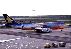 Following the spinoff of Malaysia-Singapore Airlines, Singapore Airlines introduced a second-generation livery features a blue and yellow strip on the windows on the white fuselage, with the stylised bird logo in yellow.[42] The word "Singapore Airlines" was stylised in italics.