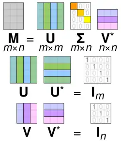 Specifically, the singular value decomposition of an complex matrix is a factorization of the form where is an complex unitary matrix, is an rectangular diagonal matrix with non-negative real numbers on the diagonal, is an complex unitary matrix, and is the conjugate transpose of . Such decomposition always exists for any complex matrix. If is real, then and can be guaranteed to be real orthogonal matrices; in such contexts, the SVD is often denoted