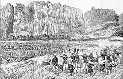 It took the French a month to complete their preparations for the Lạng Sơn Campaign. Finally, on 3 February 1885, Brière de l'Isle began his advance from Chũ with a column of just under 7,200 troops, accompanied by 4,500 coolies. In ten days the column advanced to the outskirts of Lang Son. The troops were burdened with the weight of their provisions and equipment, and had to march through extremely difficult country. They also had to fight fierce actions to overrun stoutly defended Chinese positions, at Tây Hòa (4 February), Hạ Hòa (5 February) and Đồng Sông (6 February). After a brief pause for breath at Đồng Sông, the expeditionary corps pressed on towards Lạng Sơn, fighting further actions at Quao Pass (9 February), and Vy village (11 February). On 12 February, in a costly but successful battle, the Turcos and marine infantry of Colonel Laurent Giovanninelli's 1st Brigade stormed the main Chinese defences at Bắc Việt, several kilometres to the south of Lạng Sơn.[54] On 13 February, the French column entered Lạng Sơn which the Chinese abandoned after fighting a token rearguard action at the nearby village of Kỳ Lừa.[55]