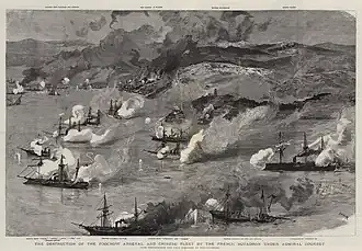 Negotiations between France and China broke down in mid-August, and on 22 August Courbet was ordered to attack the Chinese fleet at Fuzhou. In the Battle of Fuzhou (also known as the Battle of the Pagoda Anchorage) on 23 August 1884, the French took their revenge for the Bắc Lệ Ambush. In a two-hour engagement watched with professional interest by neutral British and American vessels (the battle was one of the first occasions on which the spar torpedo was successfully deployed), Courbet's Far East Squadron annihilated China's outclassed Fujian fleet and severely damaged the Foochow Navy Yard (which, ironically, had been built under the direction of the French administrator Prosper Giquel). Nine Chinese ships were sunk in less than an hour, including the corvette Yangwu, the flagship of the Fujian fleet. Chinese losses may have amounted to 3,000 dead, while French losses were minimal. Courbet then successfully withdrew down the Min River to the open sea, destroying several Chinese shore batteries from behind as he took the French squadron through the Min'an and Jinpai passes.[46]