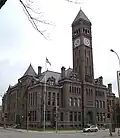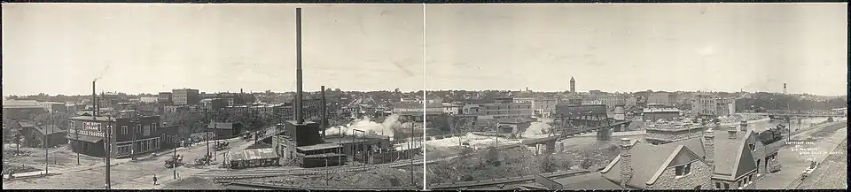 Fort Dakota, a military reservation established in present-day downtown, was established in May 1865.[14] Many former settlers gradually returned and a new wave of settlers arrived in the following years. The population grew to 593 by 1873, and a building boom was underway in that year. The Village of Sioux Falls, consisting of 1,200 acres (4.9 km2), was incorporated in 1876 and was granted a city charter by the Dakota Territorial legislature on March 3, 1883.[15]