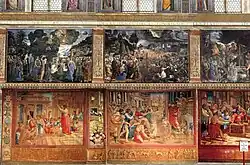 In 1515, Raphael was commissioned by Pope Leo X to design a series of ten tapestries to hang around the lower tier of the walls.[22] The tapestries depict events from the Life of St. Peter [four tapestries] the Life of St. Paul [six tapestries], the founders of the Christian Church in Rome. Work began in mid-1515. Due to their large size, manufacture of the hangings was carried out in Brussels, and took four years under the hands of the weavers in the shop of Pieter van Aelst.[23] Raphael's tapestries were looted during the Sack of Rome in 1527 and were either burnt for their precious metal content or were scattered around Europe. In the late 20th century, a set was reassembled from several further sets that had been made after the first set, and displayed again in the Sistine Chapel in 1983. The tapestries continue to be used at occasional ceremonies of particular importance. The full-size preparatory cartoons for seven of the 10 tapestries are known as the Raphael Cartoons and are in London.[24]