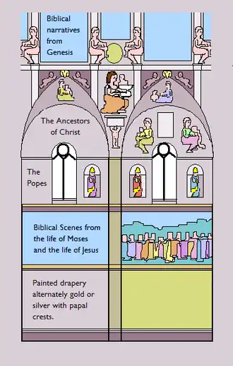 At this point, the decorative scheme displayed a consistent iconographical pattern. The tier of Popes, which, in the scheme intended by Pope Julius, would have appeared immediately below the Twelve Apostles, would have emphasised the apostolic succession. It has been argued that the present scheme shows the two Biblical Testaments merged in order to reveal the Old predicting and framing the New, synthesizing the logic of the Christian Bible.[25]