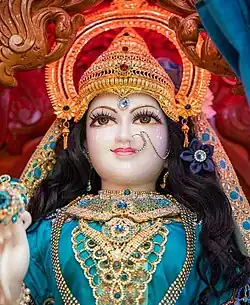 In Rama and Sita's temple, she is always placed on Rama's right, with a golden-yellow complexion.[82] She is dressed in traditional sari or ghagra-choli along with a veil. Her jewelry is either made of metals, pearls or flowers.[83]