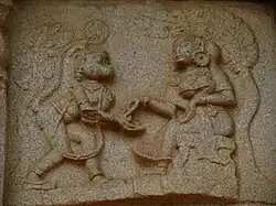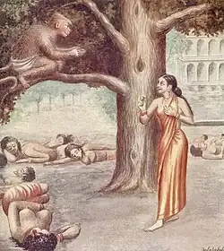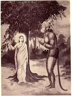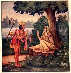 Ravana took Sita back to his kingdom in Lanka and she was held as a prisoner in one of his palaces. During her captivity for a year in Lanka, Ravana expressed his desire for her; however, Sita refused his advances.[35] Hanuman was sent by Rama to seek Sita and eventually succeeded in discovering Sita's whereabouts. Sita gave Hanuman her jewellery and asked him to give it to her husband. Hanuman returned across the sea to Rama.[36]