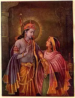 The Sita-Rama and Radha-Krishna pairs represent two different personality sets, two perspectives on dharma and lifestyles, both cherished in the way of life called Hinduism.[70] Sita is traditionally wedded: the dedicated and virtuous wife of Rama, an introspective temperate paragon of a serious, virtuous man.[71][72] Radha is a power potency of Krishna, who is a playful adventurer.[73][70]