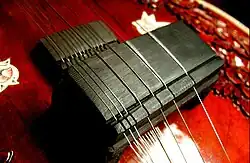 The instrument has two bridges: the large bridge (badaa goraa) for the playing and drone strings and the small bridge (chota goraa) for the sympathetic strings. Its timbre results from the way the strings interact with the wide, rounded bridge. As a string vibrates, its length changes slightly as one edge moves along the rounded bridge, promoting the creation of overtones and giving the sound its distinctive tone.[27] The maintenance of this specific tone by shaping the bridge is called jawari. Many musicians rely on instrument makers to adjust this.