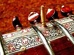 The player should re-tune for each raga. Strings are tuned by tuning pegs, and the main playing strings can be fine-tuned by sliding a bead threaded on each string just below the bridge.