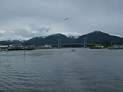 In 1937, the United States Navy established the first seaplane base in Alaska on Japonski Island, across the Sitka Channel from the town.[17] In 1941, construction began on Fort Ray, an army garrison to protect the naval air station.[17] Both the army and navy remained in Sitka until the end of WWII, when the army base was put into caretaker status. The naval station in Sitka was deactivated in June 1944.[17] A shore boat system was then established to transfer the approximately 1,000 passengers a day until the O'Connell Bridge was built in 1972.[18]