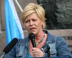 Further, in March 2009, she stated that the fight against radical Islam "is the most important fight of our time." She said that she, as a classical liberal, would always fight against totalitarian ideas such as communism and National Socialism, and that radical Islam "is a dark and scary ideology." She also accused the other parties of being cowardly, ignoring the questions raised by the Progress Party, and claimed that "it is probably an expression of the fact that they don't understand what's happening in society around them. They close their eyes and try to present themselves as tolerant and liberal, when in fact they are deeply intolerant."[34] In response to an incident in early 2010, where thousands of Muslims demonstrated in Oslo, she changed her claim of a "sneak-Islamisation" of Norway, to instead claim that the debate now was of a full-blown Islamisation.[35][36] During the demonstration (a response to newspaper Dagbladet publishing a Muhammad cartoon in the context of a news story) Islamist Mohyeldeen Mohammad had notably "warned" of a "9/11" or "7/7" in Norway to applause from the crowd.[37]