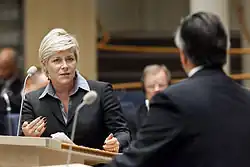 During the early 1990s, conflict within the party between the younger libertarians and party chairman Carl I. Hagen, Jensen stood on the side of Hagen.[5] She also supported Hagen in the 2001 internal conflict, and stated the same year that Hagen had been like a father figure for her.[4] She became first deputy chairman of the Progress Party in 1998, and parliamentary leader of the party in 2005. In 2006, Carl I. Hagen, chairman of the party since 1978 resigned to become vice president of parliament, and Jensen assumed leadership of the Progress Party to no internal opposition.[7] While many had been speculating about the viability of the party and its future after Hagen resigning, a 2004 survey showed that Jensen enjoyed better general support than him, which was explained by her not being as controversial.[10] Many had also predicted a more moderate course for the party with her being the leader, but she stood firmly by the policies of the party.[5] Her leadership-style has however been considered to be softer than that of Hagen.[7]