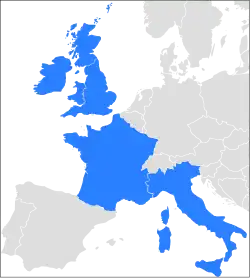 The Six Nations is the successor to the Home Nations Championship (1883–1909 and 1932–39), played by teams from England, Ireland, Scotland, and Wales, which was the first international rugby union tournament.[1] With the addition of France, this became the Five Nations Championship (1910–31 and 1947–99), and the Six Nations Championship with Italy joining in 2000.