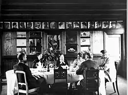 The group was reputed to have adopted a bohemian lifestyle. It encompassed not only painters, but also writers, and other influential people. While only a few were full-time residents of the area, they were often joined by family and friends, especially during the summer months. The group initially revolved around Michael Ancher and his wife to be Anna, the only member of the group who was a native of Skagen. P.S. Krøyer, who arrived in 1882, was perhaps the most colourful member of the group.[16] His painting Hip, Hip, Hurrah! shows several of the artists celebrating around a table out in the garden. The painters included the Swedes Oscar Björck and Johan Krouthén, the Norwegians Christian Krohg and Eilif Peterssen, and the Danes Karl Madsen, Laurits Tuxen, Marie Triepcke Krøyer Alfvén, Carl Locher, Viggo Johansen and Thorvald Niss. The group also included the writers Holger Drachmann, Georg Brandes and Henrik Pontoppidan and the Swedish composer Hugo Alfvén. They often gathered in Brøndums Hotel whose dining room now forms part of Skagens Museum.[15]