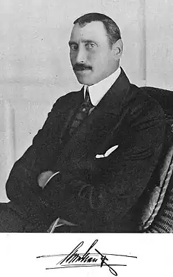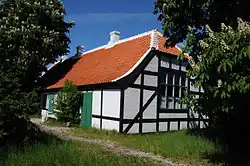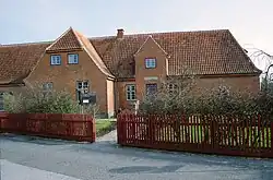 In the early 1910s, Christian X and Queen Alexandrine often visited Skagen in the royal yacht Kongeskibet Dannebrog. Occasionally they arrived by train and brought friends from other European monarchies and stayed at the Brøndums and Grenen hotels. They grew fond of the place, befriending many of the artists in Skagen.[12] Christian X bought up land in the vicinity and built the summer residence Klitgaarden as a gift for his wife. Designed by Ulrik Plesner, with furniture provided by Marie Krøyer, the villa was inaugurated on 11 April 1914, with the town celebrating the royal opening with many flags.[13] Klitgaarden was further embellished inside by local artists. It passed to Prince Knud and Princess Caroline Mathilde, and after Caroline's death in 1995, it was converted into a villa retreat for scholars in 2000.[13] Composer Carl Nielsen also frequented Skagen in his youth, and he purchased a plot of land on Vestre Strandvej at Vesterby in 1918 with his sculptor wife Anne Marie Carl-Nielsen, using one of the two small half-timbered houses there as a residence and studio.[13] They named it "Finis Terrae", meaning "end of the world". The Nielsen family owned the property until 1957 when they sold it to Frode Jensen, a machinery manufacturer.[13]
