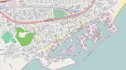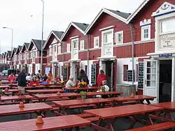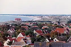 Skagen is Denmark's northernmost town, located 41 kilometres (25 mi) north of Frederikshavn, 108 kilometres (67 mi) northeast of Aalborg, and 226 kilometres (140 mi) northeast of Aarhus by road.[19] It takes its name from the peninsula that projects into the waters between the North Sea and the straits of Denmark. The oldest areas lie along the south coast. Gammel Skagen (Old Skagen), also known as Højen, is located next to Nordstrand on the western side. Vesterby and Østerby are notable for their little fishermen's cottages and narrow streets.[4] Danish national road 40 to Frederikshavn passes through Skagen.[20]