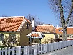 In 1879, the Skagen Fisherman's Association was established with the purpose of facilitating the local fishing industry through the railway.[10] In 1890, the Skagensbanen narrow-gauge railway from Frederikshavn finally arrived in Skagen, connecting the town to the rest of Denmark.[11] The tracks were widened in 1916 to avoid the need to transfer cargoes of fish in Frederikshavn. Many of the town's typical yellow-plastered houses with red roofs that grew up along Sankt Laurentii Vej from 1890 to 1930 were designed by Ulrik Plesner. He was also the architect behind many other buildings in the town, including the railway station, Brøndums Hotel and Skagen Museum. Skagen Missionshus was opened in 1896.[5]