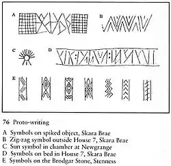 Enigmatic carved stone balls have been found at the site and some are on display in the museum.[38] Similar objects have been found throughout northern Scotland. The spiral ornamentation on some of these "balls" has been stylistically linked to objects found in the Boyne Valley in Ireland.[39][40] Similar symbols have been found carved into stone lintels and bed posts.[15] These symbols, sometimes referred to as "runic writings", have been subjected to controversial translations. For example, author Rodney Castleden suggested that "colons" found punctuating vertical and diagonal symbols may represent separations between words.[41]