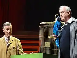 John Cleese (right) and Michael Palin of Monty Python recreating the "Dead Parrot sketch" (aired in 1969) in 2014