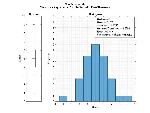 Example of an asymmetric distribution with zero skewness. This figure serves as a counterexample that zero skewness does not imply symmetric distribution necessarily. (Skewness was calculated by Pearson's moment coefficient of skewness.)