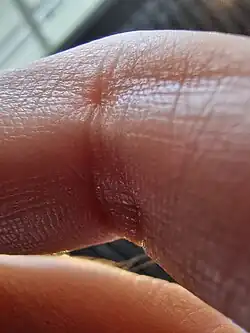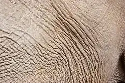 All mammals have some hair on their skin, even marine mammals like whales, dolphins, and porpoises that appear to be hairless. The skin interfaces with the environment and is the first line of defense from external factors. For example, the skin plays a key role in protecting the body against pathogens[3] and excessive water loss.[4] Its other functions are insulation, temperature regulation, sensation, and the production of vitamin D folates. Severely damaged skin may heal by forming scar tissue. This is sometimes discoloured and depigmented. The thickness of skin also varies from location to location on an organism. In humans, for example, the skin located under the eyes and around the eyelids is the thinnest skin on the body at 0.5 mm thick and is one of the first areas to show signs of aging such as "crows feet" and wrinkles. The skin on the palms and the soles of the feet is the thickest skin on the body at 4 mm thick. The speed and quality of wound healing in skin is promoted by estrogen.[5][6][7]