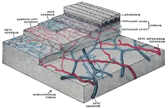 The distribution of the blood vessels in the skin of the sole of the foot. (Corium – TA alternate term for dermis – is labeled at upper right.)