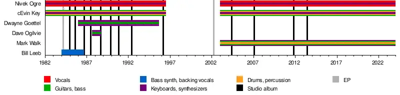 Skinny Puppy was a Canadian electro-industrial band formed in Vancouver in 1982. The group was among the founders of the industrial rock and electro-industrial genres. Initially envisioned as an experimental side-project by cEvin Key (Kevin Crompton) while he was in the new wave band Images in Vogue, Skinny Puppy evolved into a full-time project with the addition of vocalist Nivek Ogre (Kevin Ogilvie). Over the course of 13 studio albums and many live tours, Key and Ogre were the only constant members. Other members have included Dwayne Goettel (1986–1995, also died in 1995), Dave "Rave" Ogilvie (long-time associate and producer from 1984 to 1996, and an official member from 1987 to 1988; not a relative of Kevin Ogilvie), Bill Leeb (1984–1986, under the pseudonym Wilhelm Schroeder), Mark Walk (2003–2023), and a number of guests, including Al Jourgensen (1989), Danny Carey (2004), and many others.
