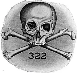 One legend is that the number represents "founded in '32, 2nd corps", referring to a first Corps in an unknown German university.[23][24] Another possible reference of 322 is the Freemasonic Lodge of Virtue and Silence no. 322, in Suffolk, England, signaling a fraternal but unspoken sponsorship between the two "secret society" organizations, regarding which silence is considered virtuous. Lodge 322 was founded in 1811,[25] 21 years before the creation of the Skull and Bones association in 1832.