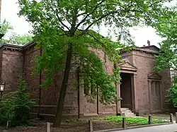 The Skull and Bones Hall, located at 64 High St. in New Haven, Connecticut, is otherwise known as the "Tomb". The building was built in three phases: the first wing was built in 1856, the second wing in 1903, and Davis-designed Neo-Gothic towers were added to the rear garden in 1912. The front and side facades are of Portland brownstone in an Egypto-Doric style. The architect was possibly Alexander Jackson Davis or Henry Austin. Architectural historian Patrick Pinnell includes an in-depth discussion of the dispute over the identity of the original architect in his 1999 Yale campus history. Pinnell speculates that the re-use of the Davis towers in 1911 suggests Davis's role in the original building and, conversely, Austin was responsible for the architecturally similar brownstone Egyptian Revival Grove Street Cemetery gates, built in 1845. Pinnell also discusses the Tomb's esthetic place about its neighbors, including the Yale University Art Gallery.[32]