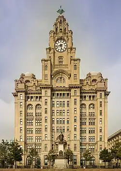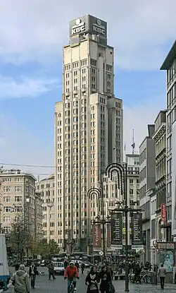Concerns about aesthetics and fire safety had likewise hampered the development of skyscrapers across continental Europe for the first half of the 20th century. By 1940, there were around 100 high-rise buildings in Europe (List of early skyscrapers). Some examples of these are the 43 m (141 ft) tall 1898 Witte Huis (White House) in Rotterdam; the 51.5 m (169 ft) tall PAST Building (1906–1908) in Warsaw; the Royal Liver Building in Liverpool, completed in 1911 and 90 m (300 ft) high;[34] the 57 m (187 ft) tall 1924 Marx House in Düsseldorf, the 65 m (213 ft) tall Borsigturm in Berlin, built in 1924, the 65 m (213 ft) tall Hansahochhaus in Cologne, Germany, built in 1925; the 61 m (200 ft) Kungstornen (Kings' Towers) in Stockholm, Sweden, which were built 1924–25;[35] the 77 m (253 ft) Ullsteinhaus in Berlin, Germany, built in 1927; the 89 m (292 ft) Edificio Telefónica in Madrid, Spain, built in 1929; the 87.5 m (287 ft) Boerentoren in Antwerp, Belgium, built in 1932; the 66 m (217 ft) Prudential Building in Warsaw, Poland, built in 1934; and the 108 m (354 ft) Torre Piacentini in Genoa, Italy, built in 1940.