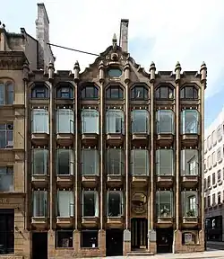 In 1857, Elisha Otis introduced the safety elevator at the E. V. Haughwout Building in New York City, allowing convenient and safe transport to buildings' upper floors. Otis later introduced the first commercial passenger elevators to the Equitable Life Building in 1870, considered by some architectural historians to be the first skyscraper. Another crucial development was the use of a steel frame instead of stone or brick, otherwise the walls on the lower floors on a tall building would be too thick to be practical. An early development in this area was Oriel Chambers in Liverpool, England, built in 1864. It was only five floors high.[25][26] The Royal Academy of Arts states, "critics at the time were horrified by its 'large agglomerations of protruding plate glass bubbles'. In fact, it was a precursor to Modernist architecture, being the first building in the world to feature a metal-framed glass curtain wall, a design element which creates light, airy interiors and has since been used the world over as a defining feature of skyscrapers".[27]