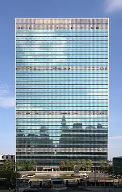 The building sector accounts for approximately 50% of greenhouse gas emissions, with operational energy accounting for 80-90% of building related energy use.[84] Operational energy use is affected by the magnitude of conduction between the interior and exterior, convection from infiltrating air, and radiation through glazing. The extent to which these factors affect the operational energy vary depending on the microclimate of the skyscraper, with increased wind speeds as the height of the skyscraper increases, and a decrease in the dry bulb temperature as the altitude increases.[84] For example, when moving from 1.5 meters to 284 meters, the dry bulb temperature decreased by 1.85 °C while the wind speeds increased from 2.46 meters per seconds to 7.75 meters per second, which led to a 2.4% decrease in summer cooling in reference to the Freedom Tower in New York City. However, for the same building it was found that the annual energy use intensity was 9.26% higher because of the lack of shading at high altitudes which increased the cooling loads for the remainder of the year while a combination of temperature, wind, shading, and the effects of reflections led to a combined 13.13% increase in annual energy use intensity.[85]