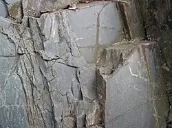 Slate is a fine-grained, metamorphic rock that shows no obvious compositional layering but can easily be split into thin slabs and plates.[2][3] It is usually formed by low-grade regional metamorphism of mudrock.[4][5] This mild degree of metamorphism produces a rock in which the individual mineral crystals remain microscopic in size,[5] producing a characteristic slaty cleavage in which fresh cleavage surfaces appear dull. This is in contrast to the silky cleaved surfaces of phyllite, which is the next-higher grade of metamorphic rock derived from mudstone.[6] The direction of cleavage is independent of any sedimentary structures in the original mudrock, reflecting instead the direction of regional compression.[7]
