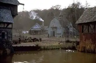 The windmill was a 60-foot-tall forced-perspective exterior (visible to highway travellers miles away), a base and rooftop set and a quarter-scale miniature. The interior of the mill, which was about 30 feet high and 25 feet wide, featured wooden gears equipped with mechanisms for grinding flour. A wider view of the windmill was rendered on a Leavesden soundstage set with a quarter-scale windmill, complete with rotating vanes, painted sky backdrop and special-effects fire. "It was scary for the actors who were having burning wood explode at them," Heinrichs recalled. "There were controls in place and people standing by with hoses, of course, but there's always a chance of something going wrong."[54] For the final shot of the burning mill exploding, the quarter-scale windmill and painted backdrop were erected against the outside wall of the "flight shed", a spacious hangar on the far side of Leavesden Studios. The hangar's interior walls were knocked down to create a 450-foot run, with a 40-foot width still allowing for coach and cameras. Heinrichs tailored the sets so cinematographer Emmanuel Lubezki could shoot from above without seeing the end of the stage.[54]