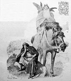 In chapter 16 of the book Skáldskaparmál, a kenning given for Loki is "relative of Sleipnir."[12] In chapter 17, a story is provided in which Odin rides Sleipnir into the land of Jötunheimr and arrives at the residence of the jötunn Hrungnir. Hrungnir asks "what sort of person this was" wearing a golden helmet, "riding sky and sea," and says that the stranger "has a marvellously good horse." Odin wagers his head that no horse as good could be found in all of Jötunheimr. Hrungnir admitted that it was a fine horse, yet states that he owns a much longer-paced horse; Gullfaxi. Incensed, Hrungnir leaps atop Gullfaxi, intending to attack Odin for Odin's boasting. Odin gallops hard ahead of Hrungnir, and, in his, fury, Hrungnir finds himself having rushed into the gates of Asgard.[13] In chapter 58, Sleipnir is mentioned among a list of horses in Þorgrímsþula: "Hrafn and Sleipnir, splendid horses [...]".[14] In addition, Sleipnir occurs twice in kennings for "ship" (once appearing in chapter 25 in a work by the skald Refr, and "sea-Sleipnir" appearing in chapter 49 in Húsdrápa, a work by the 10th century skald Úlfr Uggason).[15]