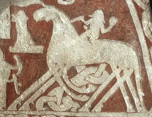 Two of the 8th century picture stones from the island of Gotland, Sweden depict eight-legged horses, which are thought by most scholars to depict Sleipnir: the Tjängvide image stone and the Ardre VIII image stone. Both stones feature a rider sitting atop an eight-legged horse, which some scholars view as Odin. Above the rider on the Tjängvide image stone is a horizontal figure holding a spear, which may be a valkyrie, and a female figure greets the rider with a cup. The scene has been interpreted as a rider arriving at the world of the dead.[21] The mid-7th century Eggja stone bearing the Odinic name haras (Old Norse 'army god') may be interpreted as depicting Sleipnir.[22] The English Runic Inscription 2 (11th century) is also believed by some scholars to depict Sleipnir.[23]