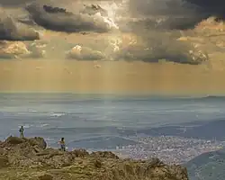 The most visited geographical location and attraction in the city is the Karandila (Карандила). It is a hilltop 1050m above sea level, with great sights overlooking the city. The rock formation Halkata (Хaлката, "The Ring") is located on the Karandila. It is a rock protrusion with a peculiar hole in the center. According to myth, one would have their most sincere wish granted upon passing through the ring. Karandila is the site of the annual Karakachani festival, organized by the Federation of the Cultural and Educational Associations of Karakachans (ФКПДК) in Bulgaria each July.[5]