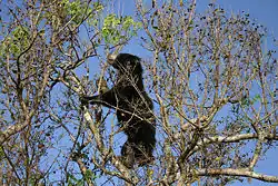 Sloth bear fur is completely black (rusty for some specimens), save for a whitish Y- or V-shaped mark on the chest.[24] This feature is sometimes absent, particularly in Sri Lankan specimens.[11] This feature, which is also present in Asian black bears and sun bears, is thought to serve as a threat display, as all three species are sympatric with tigers (tigers usually do not carry out attacks on an adult bear if the bear is aware or facing the cat).[11] The coat is long, shaggy, and unkempt, despite the relatively warm environment in which the species is found, and is particularly heavy behind the neck and between the shoulders, forming a mane which can be 30 cm (12 in) long.[11][24] The belly and underlegs can be almost bare. Sloth bears are usually about the same size as an Asian black bear but are immediately distinctive for their shaggier coat, whitish claws, as well as their typically rangier build. Their head and mouth is highly distinct from that of a black bear with a longer, narrower skull shape (particularly the snout), loose-looking, flappier lips and paler muzzle colour. In few areas of overlap, sloth bear confusion with sun bears is unlikely, given the latter species considerably smaller size, much shorter fur, wrinkled folding skin (especially around the back), bolder chest marking and drastically different, more compact head structure and appearance.[28][30]
