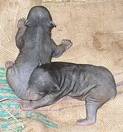 The breeding season for sloth bears varies according to location: in India, they mate in April, May, and June, and give birth in December and early January, while in Sri Lanka, it occurs all year. Sows gestate for 210 days, and typically give birth in caves or in shelters under boulders. Litters usually consist of one or two cubs, or rarely three.[31] Cubs are born blind, and open their eyes after four weeks.[35] Sloth bear cubs develop quickly compared to most other bear species: they start walking a month after birth, become independent at 24–36 months, and become sexually mature at the age of three years. Young cubs ride on their mother's back when she walks, runs, or climbs trees until they reach a third of her size. Individual riding positions are maintained by cubs through fighting. Intervals between litters can last two to three years.[31]