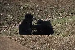 Adult sloth bears may travel in pairs. Males are often observed to be gentle with cubs. They may fight for food. They walk in a slow, shambling motion, with their feet being set down in a noisy, flapping motion. They are capable of galloping faster than running humans.[31] Although they appear slow and clumsy, both young and adult sloth bears are excellent climbers.[32] They occasionally will climb to feed and to rest, though not to escape enemies, as they prefer to stand their ground. Sloth bear mothers carry their cubs up trees as the primary defense against attacks by predators instead of sending them up trees. The cubs can be threatened by predators such as tigers, leopards, and other bears.[33] They are adequate climbers on more accessible trees but cannot climb as quickly or on as varied surfaces as can black bears due to the sloth species' more elongated claw structure. Given their smaller size and still shorter claws, sloth bear cubs probably climb more proficiently than adults (much as brown bear cubs can climb well but not adults).[24] They are good swimmers, and primarily enter water to play.[24]