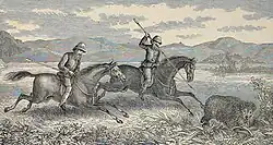 One method of hunting sloth bears involved the use of beaters, in which case, a hunter waiting on a post could either shoot the approaching bear through the shoulder or on the white chest mark if it was moving directly to him. Sloth bears are very resistant to body shots, and can charge hunters if wounded, though someone of steady nerves could score a direct hit from within a few paces of a charging bear. Sloth bears were easy to track during the wet season, as their clear footprints could be followed straight to their lairs. The majority of sloth bears killed in forests were due to chance encounters with them during hunts for other game. In hilly or mountainous regions, two methods were used to hunt them there. One was to lie in wait above the bear's lair at dawn and wait for the bear to return from its nocturnal foraging. Another was to rouse them at daytime by firing flares into the cave to draw them out.[69] Sloth bears were also occasionally speared on horseback.[7] In Sri Lanka, the baculum of a sloth bear was once used as a charm against barrenness.[29]