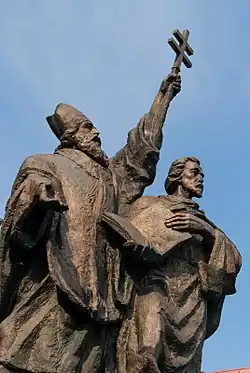 On Rastislav's request, two brothers, Byzantine officials and missionaries Saints Cyril and Methodius came in 863. Cyril developed the first Slavic alphabet and translated the Gospel into the Old Church Slavonic language. Rastislav was also preoccupied with the security and administration of his state. Numerous fortified castles built throughout the country are dated to his reign and some of them (e.g., Dowina, sometimes identified with Devín Castle)[32][33] are also mentioned in connection with Rastislav by Frankish chronicles.[34][35]