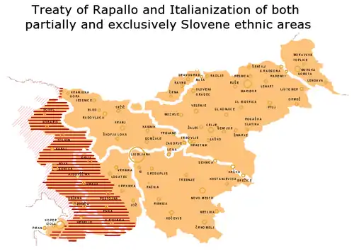 In the ex-Austrian Empire area given to Italy in exchange for joining Great Britain in World War I, the forced Fascist Italianization of the Slovene minority in Italy (1920–1947) was under no international restraint especially after Benito Mussolini came to power in 1922. Already during the period of Italian occupation, between the years 1918 and 1920, all Slovene cultural associations (Sokol, "reading rooms" etc.) had been forbidden.[75] Fascist Italy brought Italian teachers from southern Italy to Italianize ethnic Slovene and Croatian children,[76] while the Slovene and Croatian teachers, poets, writers, artists and clergy were exiled to Sardinia and elsewhere to southern Italy. In 1926, claiming that it was restoring surnames to their original Italian form, the Italian government announced the Italianization of names and surnames not only of citizens of the Slovene minority, but also of Croatian and German.[77][78] Some Slovenes willingly accepted Italianization in order to lose the status of being second-class citizens with no upward social mobility. By the mid-1930s, around 70,000 Slovenes had fled the region, mostly to Yugoslavia and South America.