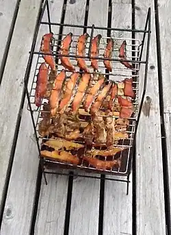 Hot smoking cooks foods and simultaneously flavors them with smoke in a controlled environment such as a smoker oven or smokehouse. It requires consistent control of both the temperature of the food and the amount of smoke being applied to it. Some smokers have a heat source built into them, while others use the heat from a stove-top or oven.[10] Like cold smoking, the item may be hung first to develop a pellicle; it is then smoked from 1 hour to as long as 24 hours. Although foods that have been hot smoked are often reheated or further cooked, they are typically safe to eat without further cooking. The temperature range for hot smoking is usually between 52 and 80 °C (126 and 176 °F).[11] Foods smoked in this temperature range are usually fully cooked, but still moist and flavorful. At smoker temperatures hotter than 85 °C (185 °F), foods can shrink excessively, buckle, or even split. Smoking at high temperatures also reduces yield, as both moisture and fat are cooked away.