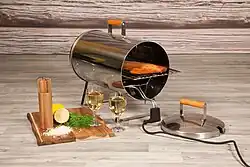 Cold smoking differs from hot smoking in that it does not cook anything; when cold smoking is finished, the food is still raw.[10] Smokehouse temperatures for cold smoking are typically between 20 and 30 °C (68 and 86 °F).[11] In this temperature range, foods take on a smoked flavor, but remain relatively moist. Since cold smoking does not cook foods, meats should be fully cured before cold smoking.[11] Cold smoking can be used as a flavor enhancer for items such as cheese or nuts, along with meats such as chicken breasts, beef, pork chops, salmon, scallops, and steak. The item is often hung in a dry environment first to develop a pellicle; it can then be cold smoked up to several days to ensure it absorbs the smoke flavor. Some cold smoked foods are baked, grilled, steamed, roasted, or sautéed before eating.