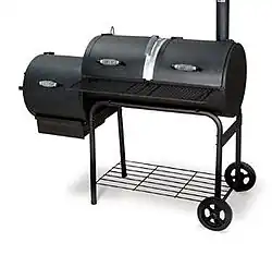 A reverse flow offset smoker is a variation of the traditional offset design. In this configuration, a solid baffle plate or duct forces the heat and smoke to travel beneath the food before rising and reversing direction to exit through a chimney positioned on the same side as the firebox. This setup promotes more consistent temperatures across the cooking chamber and enhances smoke distribution, which can result in more even cooking. Reverse flow smokers are popular among pitmasters seeking stable heat and reduced hot spots.[16][17]