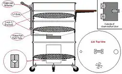 The upright drum smoker (also referred to as an ugly drum smoker or UDS) is exactly what its name suggests: an upright steel drum that has been modified for the purpose of pseudo-indirect hot smoking. There are many ways to accomplish this, but the basics include the use of a complete steel drum, a basket to hold charcoal near the bottom, and a cooking rack (or racks) near the top, all covered by a vented lid of some sort. These smokers have been built using many different sizes of steel drums, such as 30 US gallons (110 L; 25 imp gal), 55 US gallons (210 L; 46 imp gal), and 85 US gallons (320 L; 71 imp gal), but the most popular size is the common 55-gallon drum.
