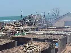 In this method the firebox is a narrow trench cut down a slope pointing into the prevailing wind. The middle part of the trench is covered over to make it into a tunnel. At the upper end of the trench is a vertical framework covered to form a chimney within which is placed the rack of foodstuff. At the lower upwind end of the trench is lit a small smokey fire, and sustained day and night until the foodstuff is cured.[19]