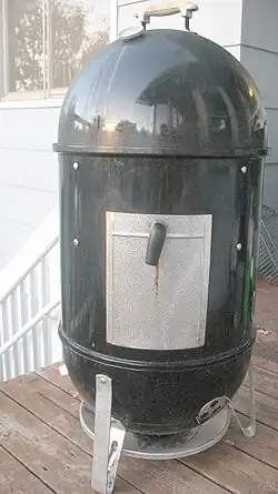 Smoke-roasting refers to any process that has the attributes of both roasting and smoking. This smoking method is sometimes referred to as barbecuing or pit-roasting. It may be done in a smoke-roaster, a closed wood-fired oven, or a barbecue pit, any smoker that can reach above 121 °C (250 °F), or in a conventional oven by placing a pan filled with hardwood chips on the floor of the oven so that the chips can smolder and produce a smoke-bath.[14] In North America, this smoking method is commonly referred to as "barbecuing", "pit baking", or "pit roasting".